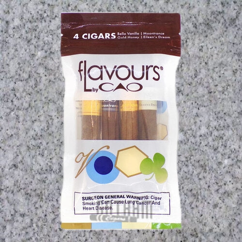 This CAO Flavours Sampler for sale includes: 1 - Bella Vanilla Petit Corona cigar - 4" x 38 1 - Eileen's Dream Petit Corona - 4" x 38 1 - Honey Gold Petit Corona - 4" x 38 1 - Moontrance Petit Corona - 4" x 38